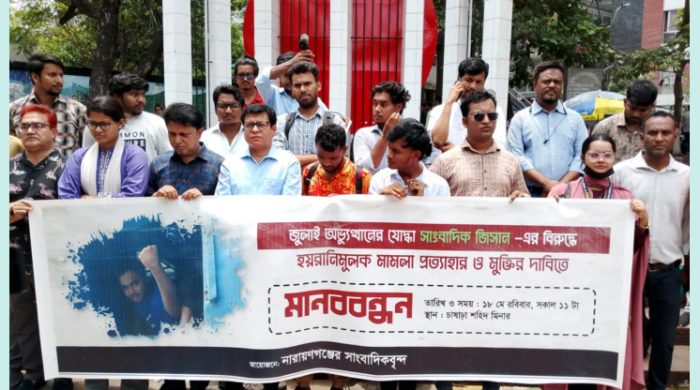 সরকারি কাজে বাধা ও পুলিশের উপর হামলার অভিযোগে মামলায় গ্রেপ্তার জুলাই অভ্যুত্থানের সক্রিয় কর্মী ও তরুণ সাংবাদিক জান্নাতুল ফেরদৌস জিসানের মুক্তির দাবি জানিয়েছেন গণমাধ্যমকর্মীরা। রোববার (১৮ মে) বেলা সোয়া এগারোটায়