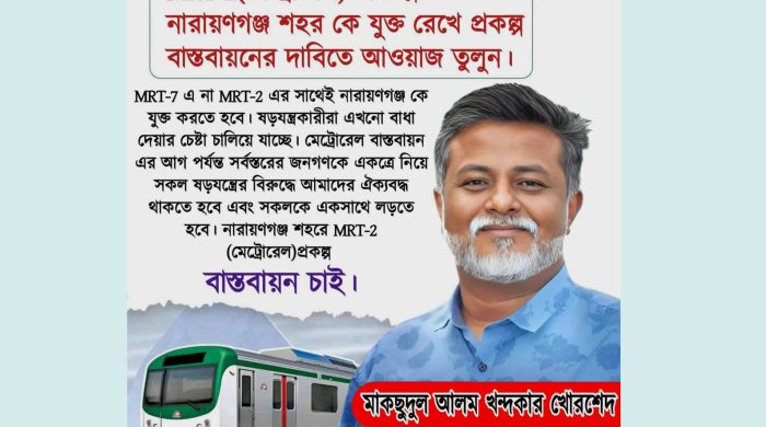 নারায়ণগঞ্জের দীর্ঘদিনের জনদুর্ভোগ ও যানজট নিরসনের লক্ষ্যে মেট্রোরেলের দাবি জানিয়েছেন ১৩নং ওয়ার্ডের সদ্য সাবেক কাউন্সিলর ও ওয়ার্কিং ফর বেটার নারায়ণগঞ্জের সমন্বয়ক মাকছুদুল আলম খন্দকার খোরশেদ। কাউন্সিলর খোরশেদ বলেন, রাজধানী ঢাকার